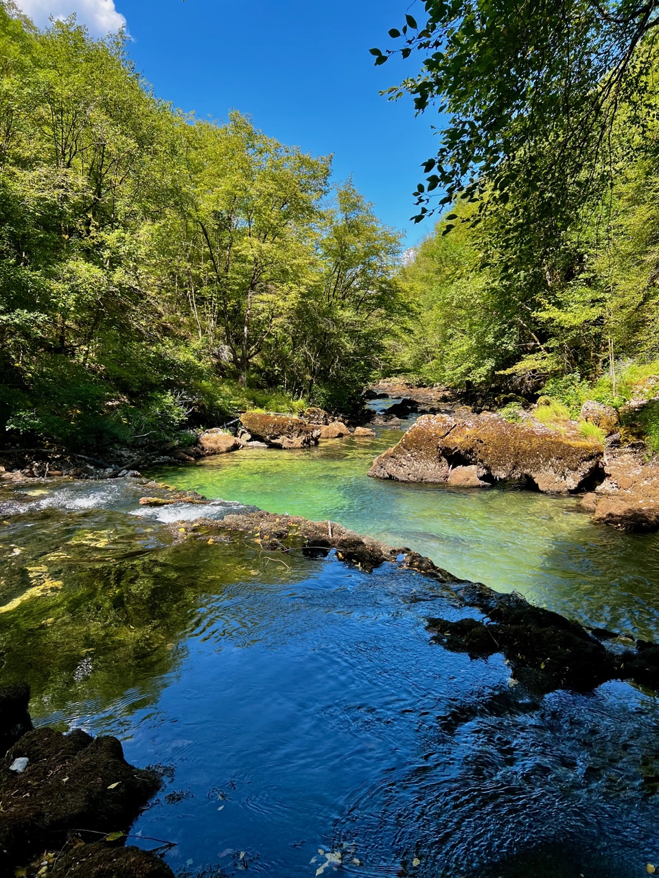 Iznenada mi se ukazuje nestvarni pogled na plavo, odnosno tirkizno jezero koji oduzima dah. Kao da nije izvor rijeke. Rimljani su joj dobro ime nadjenuli: „Una = jedina, jedinstven“, tako kažu. Dostupan je samo mali dio obale, a kako je zahvaljujući ljetu niži vodostaj koristim priliku za šetnju između brzaca jer već ovdje ta divna Una kreće sa slapovima da bi vrhunac dostigla na Štrbačkom buku tridesetk kilometara od Bihaća.