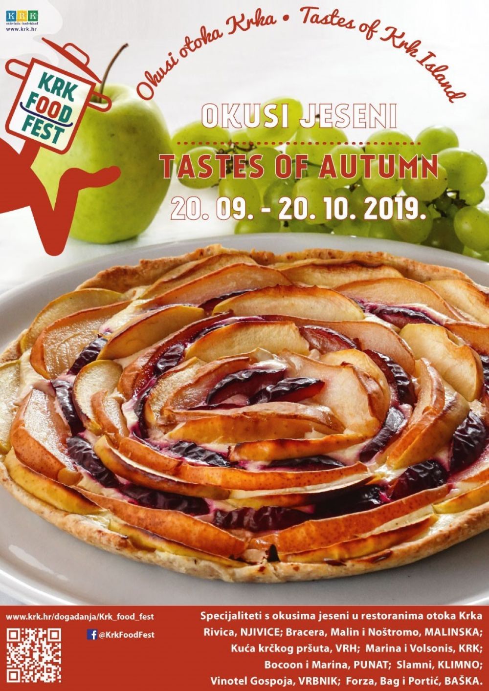 Na otoku Krku se do 20.10.2019. u 14 restorana održava manifestacija Krk food fest: Okusi jeseni. Krk nosi u sebi tragove antičkih vremena i bogate srednjevjekovne povijesti, a prekrasna priroda i more koje ga okružuju uz bogatu arheološku i kulturnu baštinu nude i niz gastronomskih razloga za posjet. Uz kvarnerske škampe, kozice, školjke, muzgavce i ribe, Krk je poznat po svojoj janjetini koja pase od mora slanu aromatičnu travu, po sorti grožđa i vina Žlahtina, po Krčkom pršutu i siru, tjestenini šurlice koje na iglama za pletenje pripremaju krčke domaćice, samoniklom začinskom bilju, ekološki uzgojenom voću i povrću te maslinovom ulju iz krčkih maslinika.