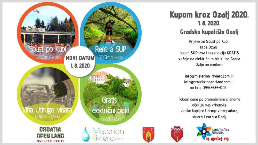 Novootvorena turistička agencija za ekološke izlete Misterion Riviera poziva na događanje Kupom kroz Ozalj koje se u novom terminu održava 1. koloviza, u Ozlju i Vrhovcu, gdje vas očekuju adrenaliske aktivnosti podijeljene u nekoliko termina. U jutarnjim satima, od 9 do 13 sati možete sudjelovati u petom izdanju atraktivne utrke Ozalj & Vrhovac Trail 2020.Tijekom dana održavaju se tri različite aktivnosti podijeljene kroz nekoliko termina; mogućnost najma popularnih SUP (stand-up-paddleboarding) dasaka za vožnju po Kupi, Spust po Kupi, te GRATIS vožnju električnim biciklima Grada Ozlja.