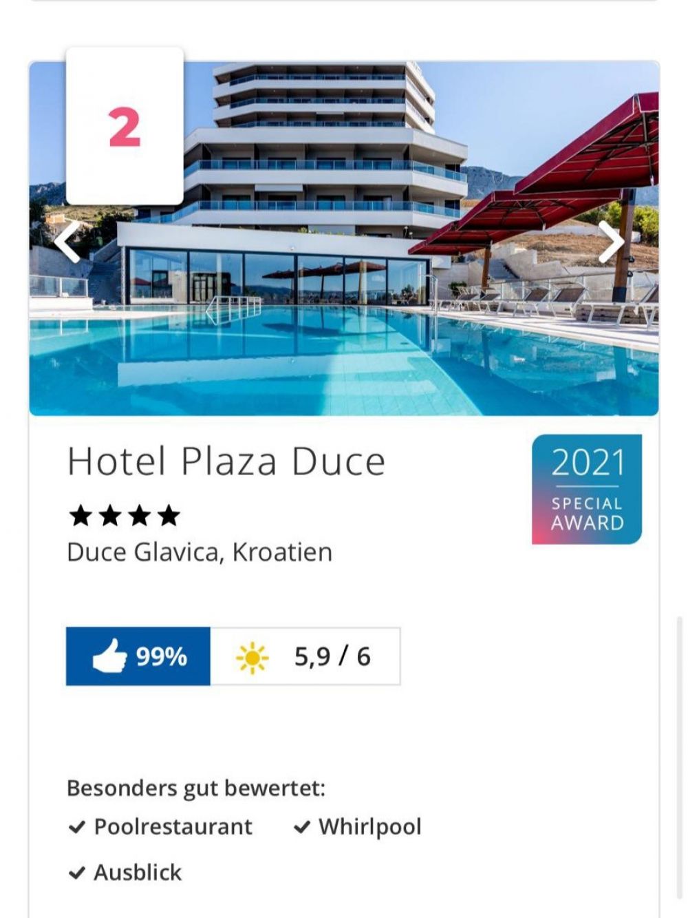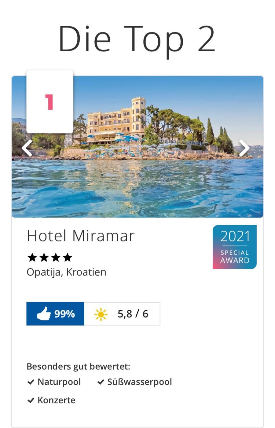 Renomirani švicarski portal HolidayCheck i ove je godine dodijelio prestižnu nagradu HolidayCheck Special Award 2021., a među 607 nagrađenih hotela našla su se i dva hrvatska hotela, izvijestila je voditeljica Ispostave Hrvatske turističke zajednice u Münchenu Nera Miličić. Prema recenzijama više od 420 tisuća korisnika portala izabrani su najbolji i najuspješniji hoteli u čak 35 zemalja, a u Hrvatskoj je nagrada dodijeljena hotelu Miramar u Opatiji te hotelu Plaža Duće s Dugog Rata.