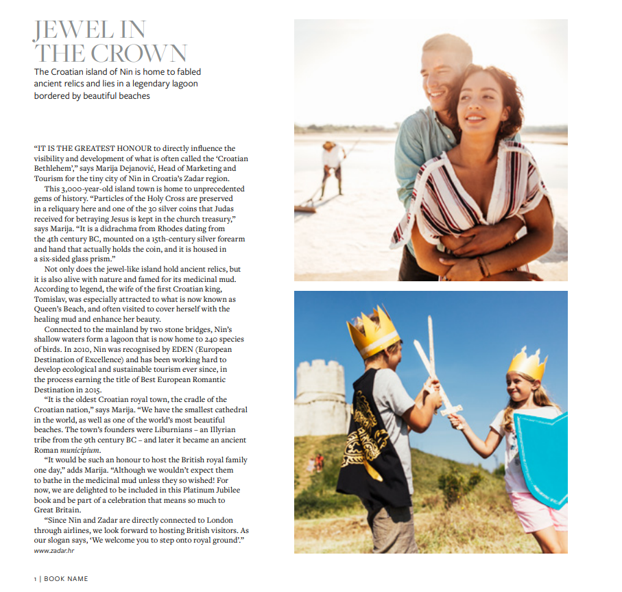 - Moram priznati da je bilo veliko iznenađenje i zadovoljstvo što smo zamijećeni u ovako važnoj kampanji i postali partneri projekta koji nas je pozicionirao uz bok cijenjenim svjetskih turističkih brendova. To je unijelo veliki entuzijazam u naš turistički ured. Stoga svih srdačno pozdravljamo iz kraljevskog grada Nina, najstarijeg hrvatskog grada, kolijevke hrvatske države te ističemo brend koji je privukao engleske urednike pri izdavanju njihove povijesne edicije - Kraljičina plaža u jedinstvenoj hrvatskoj laguni. Britansko tržište i Nin se obostrano privlače jer već ga posjećuju Englezi zbog atrakcija: relikvija povezanih s Biblijom, kraljevskog tla snažne srednjovjekovne povijesne pozicije, predromaničkih crkvica, pješčanih plaža koje Britanci vole, eko solane, bogati ptičijeg svijeta od 240 vrsta ptica, eko lječilišta s blatom na otvorenom, škole kitesurfinga i dr. Dobra povezanost Zračne luke Zadar olakšava dolazak Britanaca koji pripadaju u target skupinu visoke platežne moći kojima je vrijednost za novac itekako važan element. Ovo je prigoda da se u Ninu napravi zaokret i proces restrukturiranja smještajne ponude uz podizanje kvalitete na višu razinu kroz poticanje razvoja malih boutique hotela i heritage smještaja, naravno uz postojeću ponudu u vilama s bazenima i hotelima s pet zvijezdica u obližnjem mjestu Petrčane. Ova edicija poslužiti će Ninu kao izvrstan marketing na globalnom tržištu.