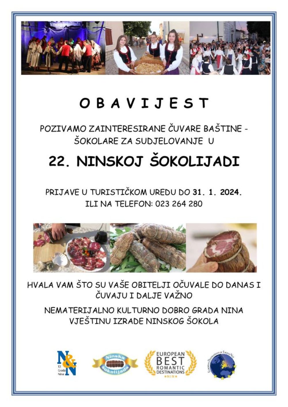 Turistička zajednica grada Nina pozivom šokolarima otpočinje pripreme za još jednu tradicionalnu Ninsku Šokolijadu koja počinje podjelom mesa u siječnju i završava proglašenjem najboljih šokolarica i šokolara u srpnju, pobjednika te najpoznatije gastronomske manifestacija Zadarske županije.