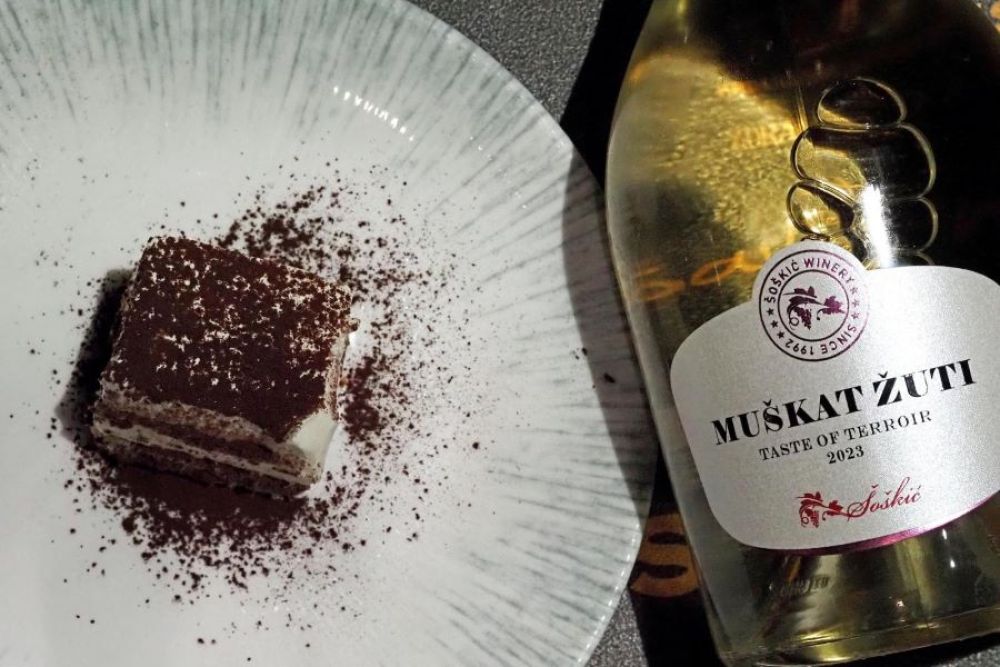 Za kraj poslužen je Tiramisu uz Muškat žuti 2023. iz plešivičke Vinarije Šoškić. Poluslatki Muškat je nastao od ručno branih i pažljivo selektiranih bobica grožđa s položaja Gorička. Vino je elegantno, nježne mineralnosti, slamnato žute boje, a dominiraju arome žutih ruža, cvjetnog meda i suhih sultana grožđica.
