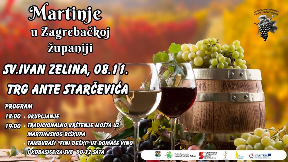 Već 8. studenog na Trgu Ante Starčevića u 18 sati započinje mnogima najljepši dio godine. Martinje dođe kao svojevrsni uvod u božićno vrijeme. Mirisi vina i hrane, dobra glazba i zagrijavanje za dan sv. Martina. Grad Sv. Ivan Zelina za svoje je posjetitelje pripremio puno dobre glazbe, tradicionalno krštenje mošta uz preštimanog i veleučenog martinjskog biškupa, te zelinske vinare i Udrugu vinara i vinogradara “Brina”. Što se glazbe tiče, očekuje vas tamburaški bend “Fini dečki”.