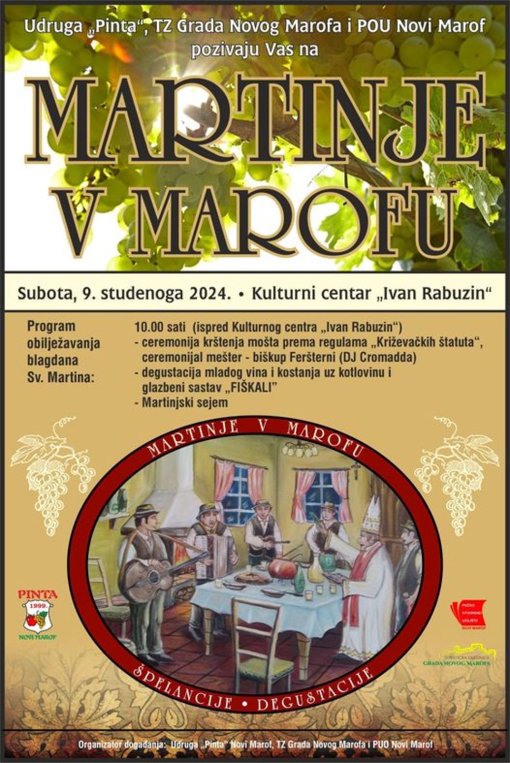 Ove subote, 9. studenoga, Udruga vinogradara i voćara "Pinta", u suradnji s Turističkom zajednicom Grada Novog Marofa, poziva Vas na proslavu Martinja. Početak je predviđen ispred Kulturnog centra "Ivan Rabuzin" a potom se ova već tradicionalna manifestacija krštenja mošta pod naslovom "Martinje v Marofu 2024", seli na Grebengrad.