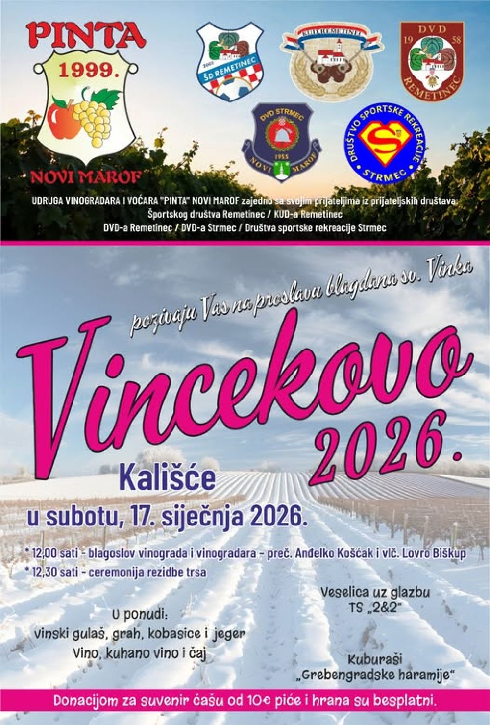 Domaćini ovogodišnjeg obilježavanja Vincekova, Udruga vinara i vinogradara Brina iz Kalinja, uz suorganizatore Grad Sveti Ivan Zelina i Turističku zajednicu grada Svetog Ivana Zeline, poručuju: „Dođite, uživajte u čarima vinogradarske tradicije i započnite novu godinu u dobrom društvu!“