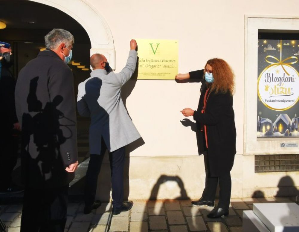 Predsjednik Gradskog vijeća Grada Varaždina Damir Habijan i zamjenica gradonačelnika Sandra Malenica u ponedjeljak su u povodu Dana grada Varaždina postavljanjem natpisne ploče uz glavni ulaz u novu Gradsku knjižnicu i čitaonicu simbolički obilježili završetak građevinskih radova na knjižnici.
