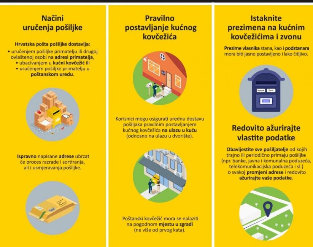 Točnim i pravilno naznačenim adresama na pošiljkama, koje odgovaraju stvarnom stanju na terenu, kao i pravilnim postavljanjem kovčežića, znatno se smanjuje broj mogućih reklamacija te osigurava kvalitetna, brza i pravilna dostava svih vrsta pošiljaka sukladno propisanim