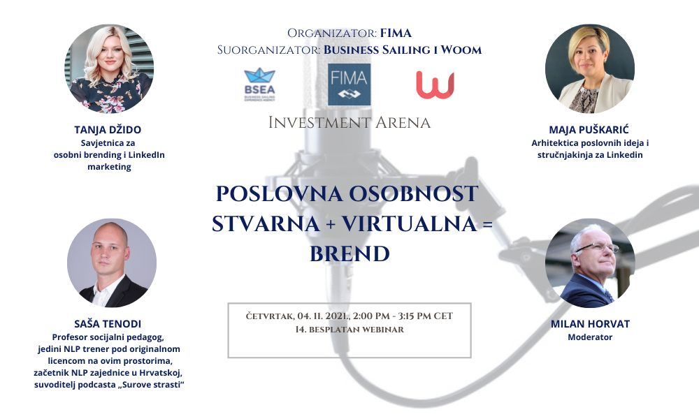 Kako vaša poslovna osobnost – stvarna i virtualna pomaže u stvaranju brenda te koja joj je uloga u procesu brendiranja, saznajte na 14. BESPLATNOM webinaru „Poslovna osobnost: stvarna + virtualna = brend“ koji će se održati 04. 11. 2021. u 14 sati.