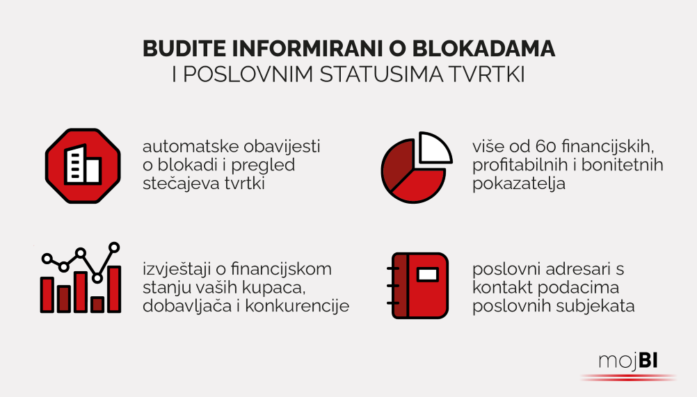 Ključ uspjeha svake tvrtke leži u sposobnosti da tijekom donošenja odluka barata s relevantnim podacima i posluje sa stabilnim partnerima. Aktivacijom usluge mojBI (business intelligence) servisa mojeRačun tvrtke dobivaju trenutnu obavijest o blokadi svojih kupaca i duljini trajanja blokade te im je na raspolaganju više od 60 financijskih i poslovnih pokazatelja uspješnosti poduzeća u Hrvatskoj.