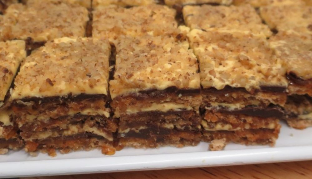 Umiješajte 12 bjelanjaka, 120 g šećera, 300 g mljevenih oraha i 3 žlice mljevenih keksa te ih ispecite u tri kore. Zatim karamelizirajte 400 g šećera i karamelom premažite svaku koru. Otopite na pari 400 g čokolade sa 100 g margarina, pa time prelijte svaku koru preko karamela. Za kremu na pari istucite 12 žutanjaka sa 8 žlica šećera, pa u ohlađeno dodajte 250 g margarina. Kremom premažite svaku koru, a gornju pospite i mljevenim orasima.