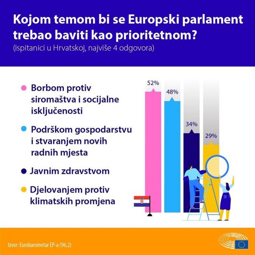 Za građane u Hrvatskoj na prvom mjestu je borba protiv siromaštva (52 %). Slijede potpora gospodarstvu i stvaranju novih radnih mjesta (48 %) te javno zdravstvo (34 %)