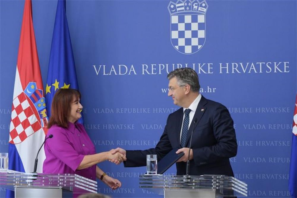 Potpredsjednica Europske komisije Dubravka Šuica uručila je potom predsjedniku Vlade prvi obrok bespovratnih sredstava iz Plana oporavka i otpornosti u iznosu od 700 milijuna eura.