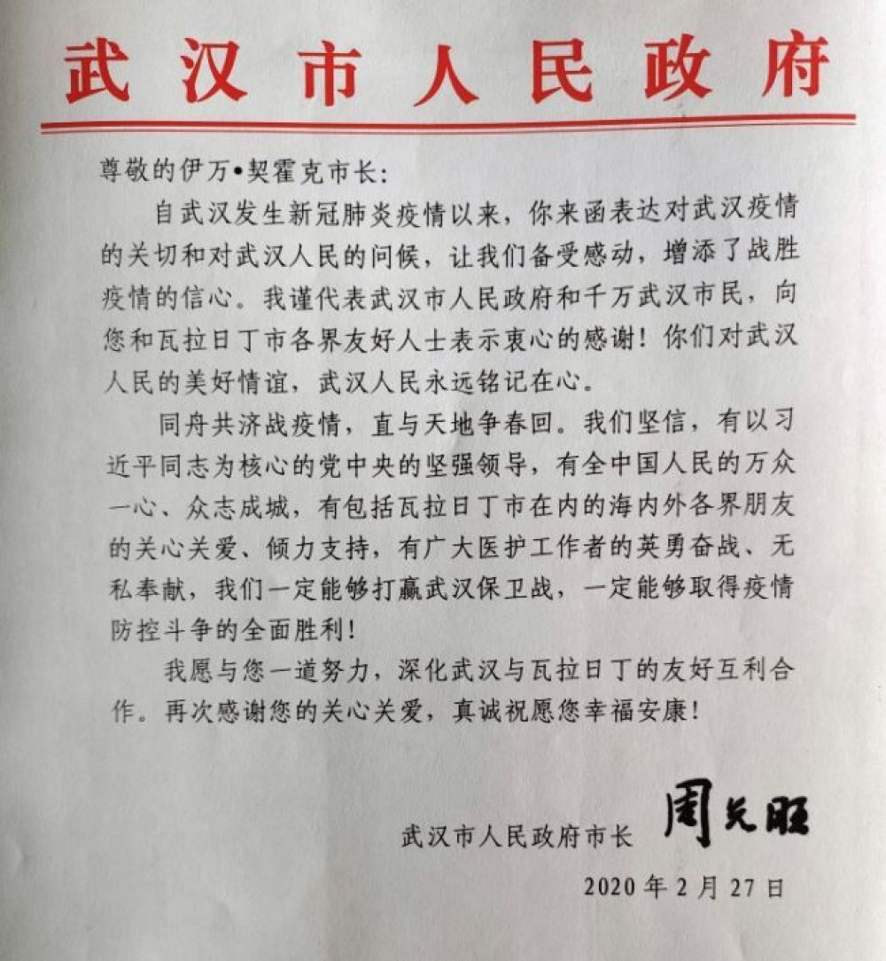 nakon izbijanja virusa COVID-19 u Wuhanu, poslali ste nam pismo u kojem izražavate zabrinutost zbog epidemije i utjehu građanima Wuhana. Duboko smo dirnuti i ojačani u uvjerenju u pobjedu u ovoj borbi protiv COVID-19. U ime Gradske narodne vlade Wuhana i milijuna građana Wuhana, želim izraziti našu iskrenu zahvalnost Vama i prijateljima iz svih područja života u Varaždinu. Vaša ljubaznost prema građanima Wuhana uvijek će biti zapamćena.
