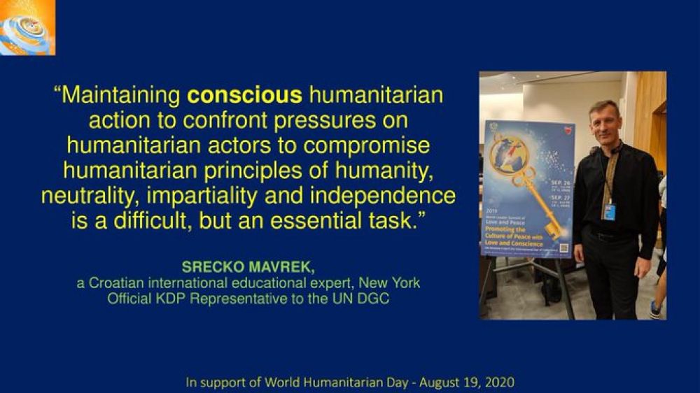 A message from Srecko Mavrek @MavrekNY, a Croatian international educational expert in New York City and an official KDP Representative to the UN DGC, in support of World Humanitarian Day #WorldHumanitarianDay #HumanitarianDay #WHD #ChangetheWorldwithConscience #MavrekNY pic.twitter.com/faOwUqPh80