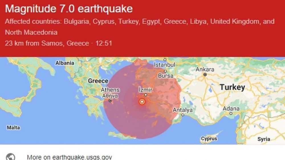 Potres magnitude 7 po Richteru pogodio grčke otoke i dio Turske na Egejskom moru. Potres se dogodio u moru, 17 kilometara zapadno od provincije Izmir u Turskoj.