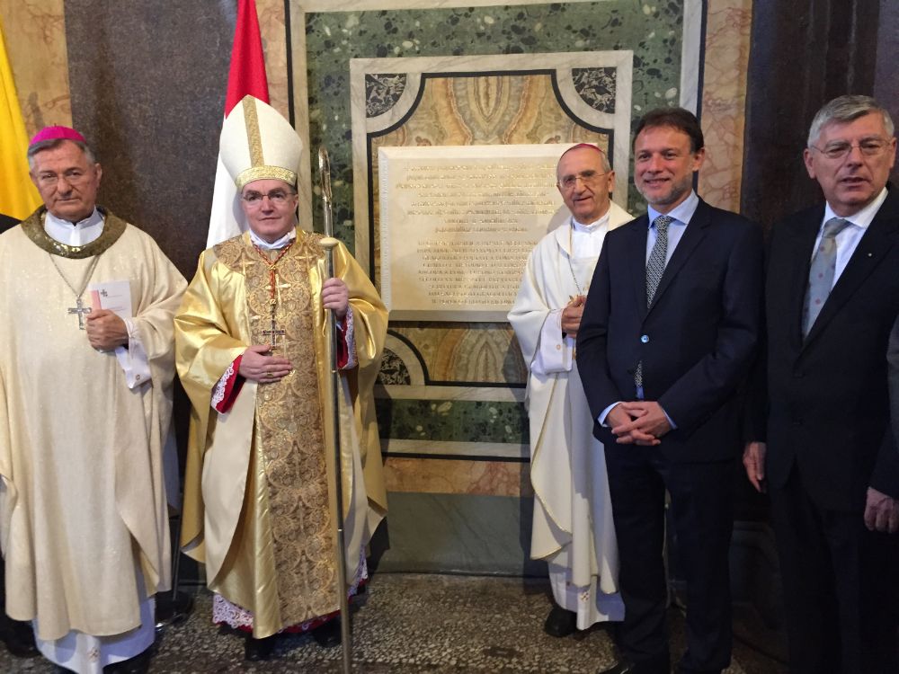 - Pobožnost i osjećaj pripadnosti katoličanstvu bile su one vrijednosti koje su očuvale kroz stoljeća hrvatski narod i odredile njegov hrvatski nacionalni identitet. Vjera i katoličanstvo uvijek su kroz povijest, a posebno onu noviju, bili simbol nacionalnog jedinstva, kohezije, opstojnosti, otpora i borbe za slobodu, rekao je predsjednik Sabora te istaknuo kako je Sveta Stolica, kao što je uvijek prepoznavala znakove vremena, tako prepoznala i razumjela hrvatsku borbu za vlastitom državom i bila prva suverena država, uz Island, koja je priznala suverenost i neovisnost Hrvatske te poručio kako joj hrvatski narod na tome izražava duboku zahvalnost. Ali i zahvalnost i ponos što je Hrvatsku u samo 27 godina njezine neovisnosti četiri puta posjetio Sveti Otac, koja se potvrđuje i postavljanjem ove ploče u Papinskoj bazilici Sv. Marije Velike, poručio je predsjednik Hrvatskoga sabora Gordan Jandroković.