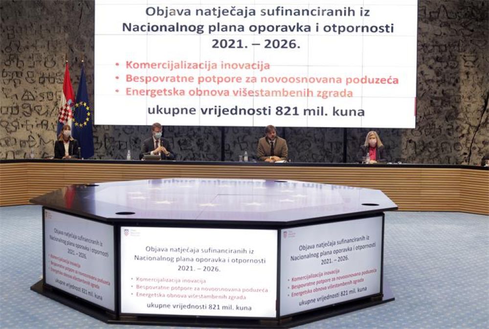 Prva tri velika natječaja u okviru Nacionalnog programa oporavka i otpornosti (NPOO), ukupnog iznosa 821 milijun kuna, predstavljena su danas, a njima će se bespovratno sufinancirati inovativni i razvojni projekti poduzeća i energetska obnova višestambenih zgrada. Ukupna vrijednost natječaja "Bespovratna potpora za novoosnovana poduzeća" iznosi 141,7 milijuna kuna, "Komercijalizacije inovacija" 380 milijuna kuna, a "Energetske obnove višestambenih zgrada neoštećenih u potresu" 300 milijuna kuna, istaknuto je na konferenciji za medije u Nacionalnoj i sveučilišnoj knjižnici, kojoj je nazočio i ministar gospodarstva i održivog razvoja Tomislav Ćorić.