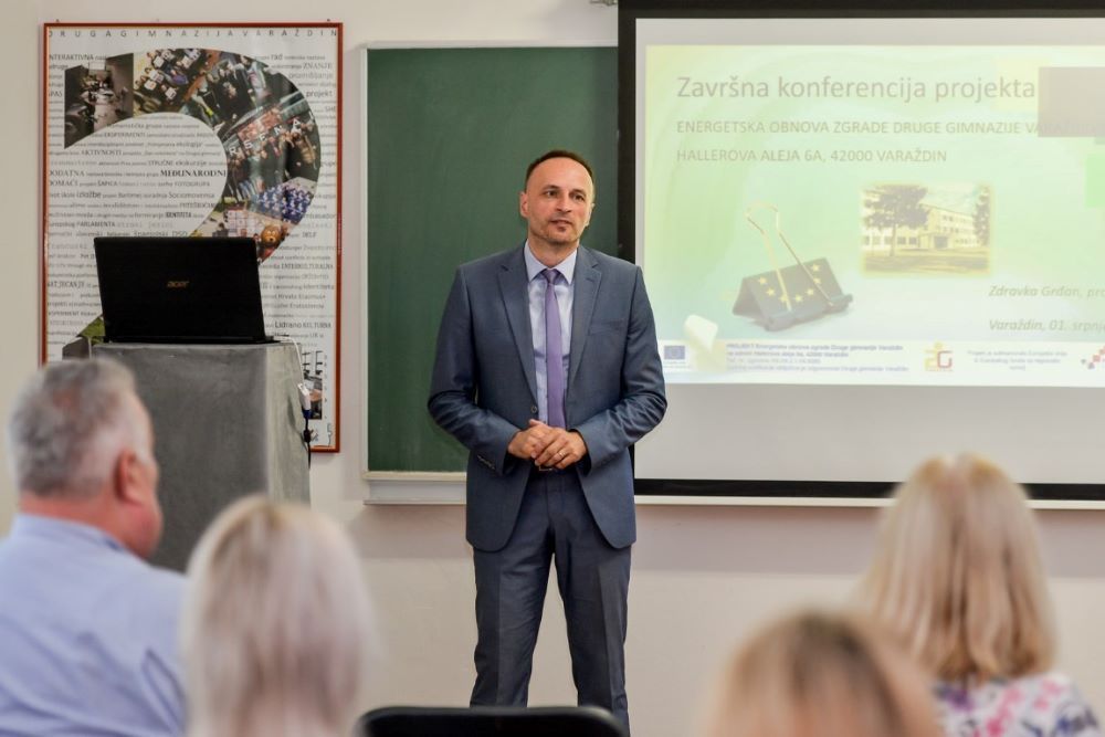 - Druga gimnazija Varaždin danas ima završnu konferenciju povodom završetka energetske obnove zgrade Druge gimnazije Varaždin. To je jedan ogroman projekt u vrijednosti od 9 700 000 kn, a radili smo ga 10. mjeseca 2017. godine do današnjeg dana. Škola je dobila u kompletu novo ruho, kompletno smo energetski obnovljeni, a od radova je odrađeno sljedeće: kompletno je promijenjeno krovište, izolacija krovišta i gore su instalirane fotonaponske ćelije za proizvodnju električne energije. Također, kompletno je promijenjena stolarija i izrađena je termo fasada. U sve su učionice ugrađeni ventilokonvektori, a uspostavljena je i nova dizalica topline prilikom koje smo dobili i grijanje i hlađenje u školi. Cilj projekta bio je smanjenje potrošnje toplinske energije i tu će biti ušteda 51% dok će smanjenje CO2 biti 87%. Očekujemo da će biti puno ugodnije i kvalitetnije boraviti i raditi u školi.