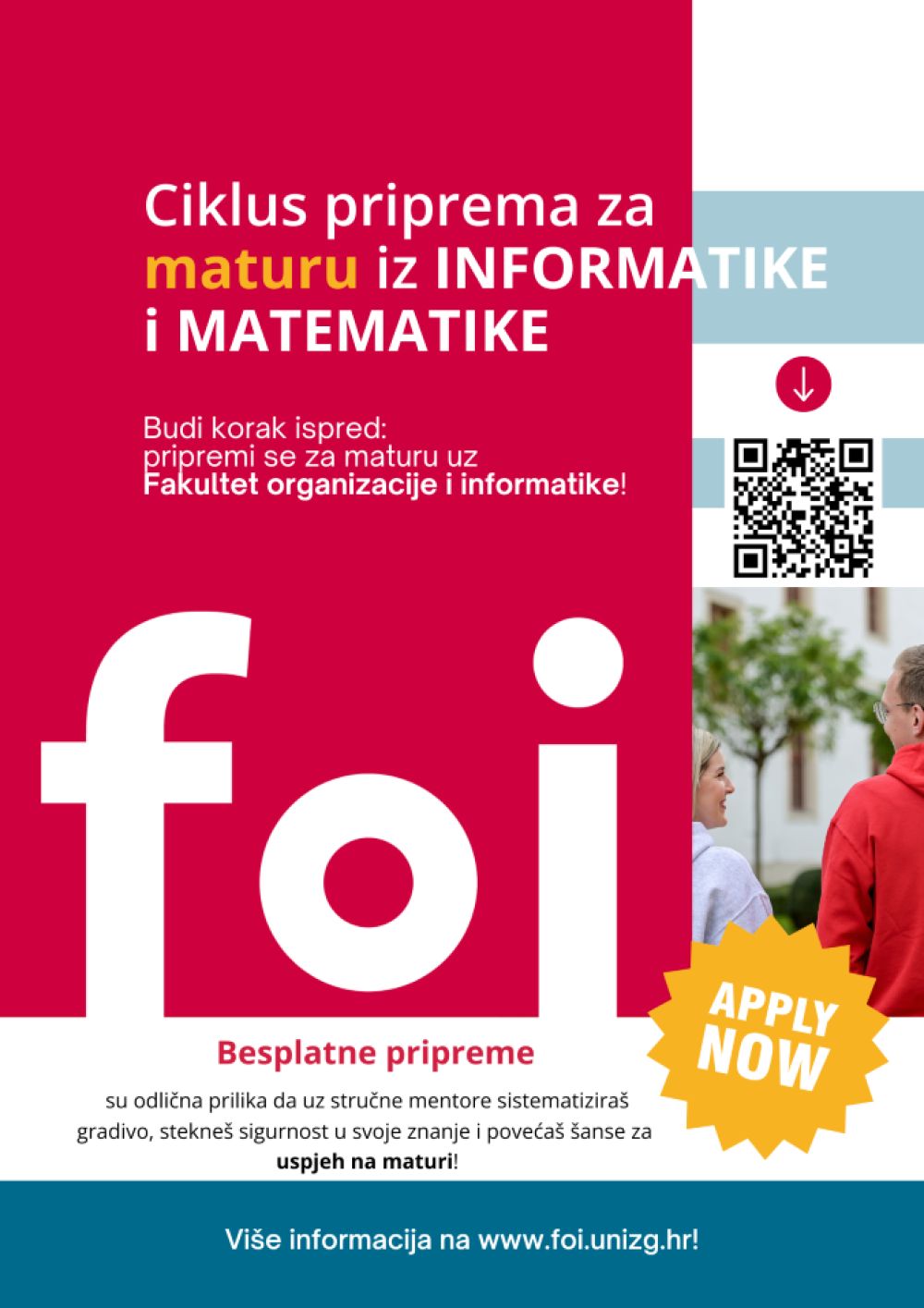 Fakultet organizacije i informatike (FOI), sastavnica Sveučilišta u Zagrebu (UNIZG) organizira besplatne pripremne radionice za maturante iz informatike kako bi im omogućio što bolju pripremu za ispit državne mature. Radionice će se održavati hibridno (na FOI-ju u Varaždinu i online) od 10. ožujka do 18. travnja. Ove radionice pružaju učenicima priliku za dodatno usavršavanje znanja i vještina potrebnih za uspješno polaganje ispita. Također, od 22. travnja do 31. svibnja održavat će se i pripreme iz matematike, o čemu će svi zainteresirani biti naknadno obaviješteni. Više informacija i prijave objavljujemo u nastavku...