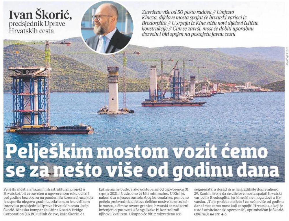 Najveći infrastrukturni projekt Vlade Andreja Plenkovića svakako je Pelješki most, koji će prema izjavi Ivana Škorića, direktora Hrvatskih cesta biti gotov za nešto više od godinu dana. Polovica od ugovorenih radova je završena, a osim Kineza koji radove nisu prekidali niti za vrijeme pandemije koronavirusa, na dijelovima metalnih konstrukcija biti će angažirani i hrvatski varioci.
