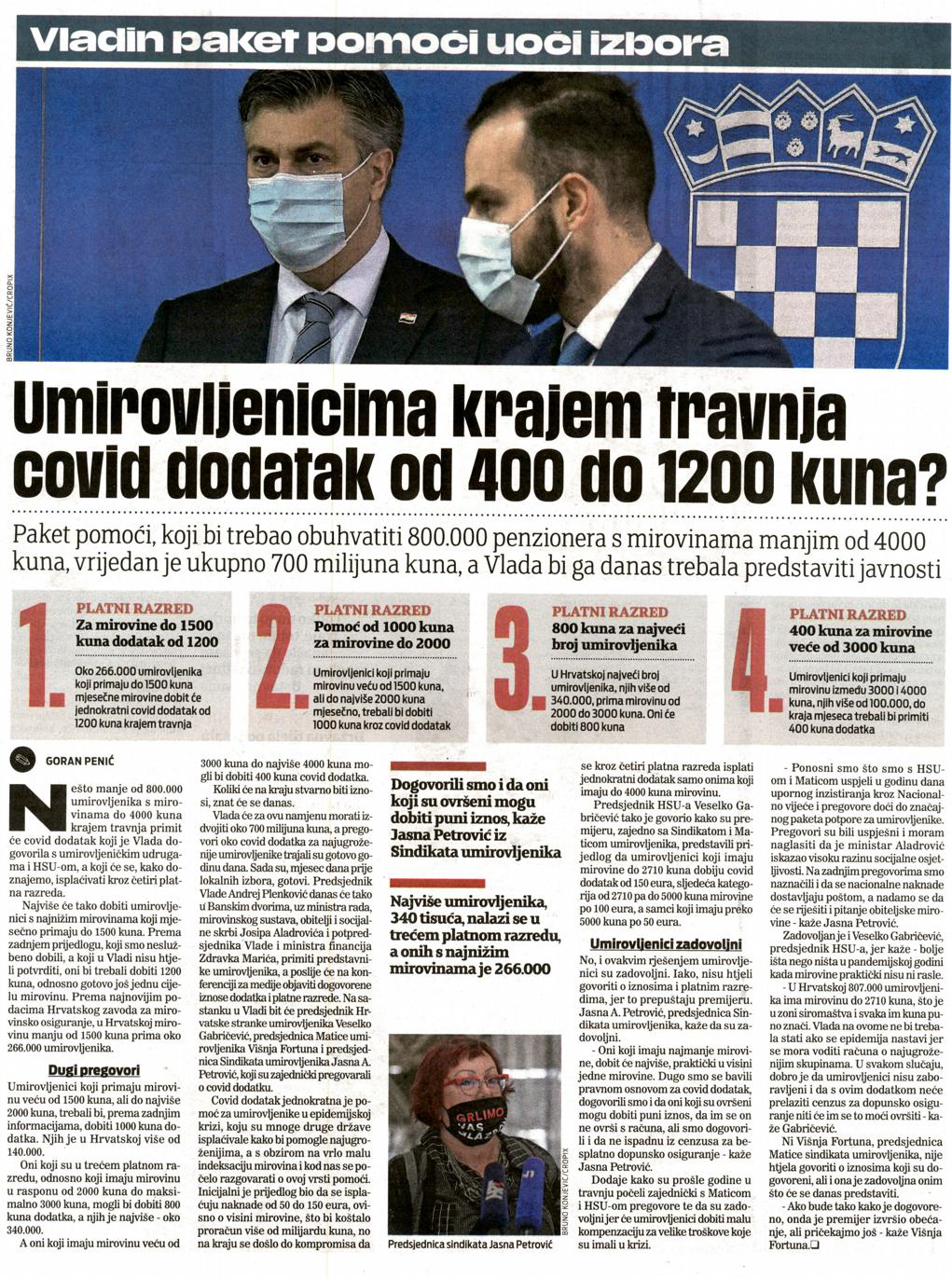 Predsjednik hrvatske Vlade Andrej Plenković primit će danas ujutro predstavnike umirovljenika. Na sastanku u Banskim dvorima dogovoriti će covid paket pomoći u rasponu od 1200 do 400 kuna za umirovljenike koji primaju mirovinu do 4000 kuna.