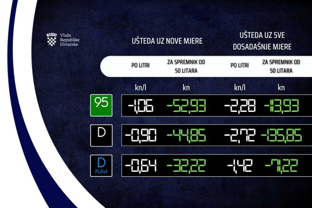 Da nije bilo Vladinih mjera, dizel bi sutra na benzinskim postajama koštao 15,80 kuna po litri, dok bi za litru benzina građani morali izdvojiti 15,78 kuna, a za plavi dizel 10,87 kuna po litri. Stupanjem na snagu Uredbe, maksimalne maloprodajne cijeni naftnih derivata iznosit će 13,08 kuna po litri za dizel, 13,50 kuna po litri za benzin te 9,45 kuna po litri za plavi dizel. Po 50-litrenom spremniku goriva, zbog svih Vladinih dosadašnjih mjera, manji su troškovi za potrošače za benzin u iznosu od oko 114 kuna, za dizel 136 kuna i za plavi dizel 71 kunu.