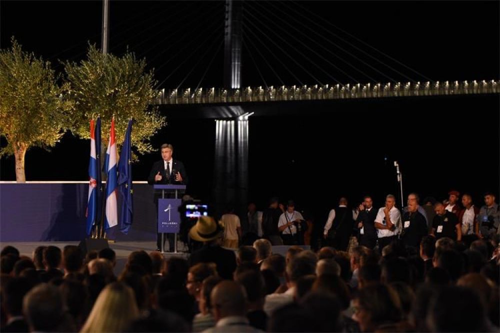 A premijer Plenković je u svom govoru poručio: "Obuzimaju me osjećaji radosti, ponosa i zahvalnosti. Radosti što smo ostvarili projekt koji je uistinu državni, strateški, svehrvatski i nadasve nestranački. Ovo je projekt generacije, projekt ponosa", istaknuo je predsjednik Vlade Plenković u prigodnom obraćanju na svečanosti otvorenja Pelješkog mosta. Zahvalio je svima koji su na bilo koji način pridonijeli realizaciji projekta spajanja hrvatskog teritorija, spajanja juga Hrvatske, južnog dijela Dubrovačko-neretvanske županije s ostatkom zemlje, naglasivši da je ovo projekt ponosa što smo dio generacije koja je ostvarila ovako veliki cilj.