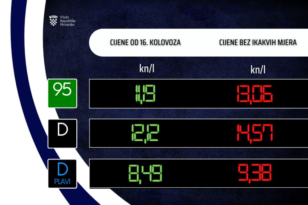 Cijene naftnih derivata određene temeljem predmetne Uredbe dodatno će se sniziti u odnosu na sada važeće, pa će od utorka nove cijene biti: benzin 11,19 kn po litri (smanjenje za 0,11 kn), dizel 12,12 kn po litri (smanjenje za 0,02 kn) i plavi dizel 8,49 kn po litri (smanjenje za 0,01 kn). Da nema mjera Vlade, benzin bi bio 13,06 kn po litri, dizel 14,57 kn po litri, a plavi dizel 9,38 kn po litri.