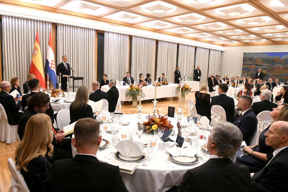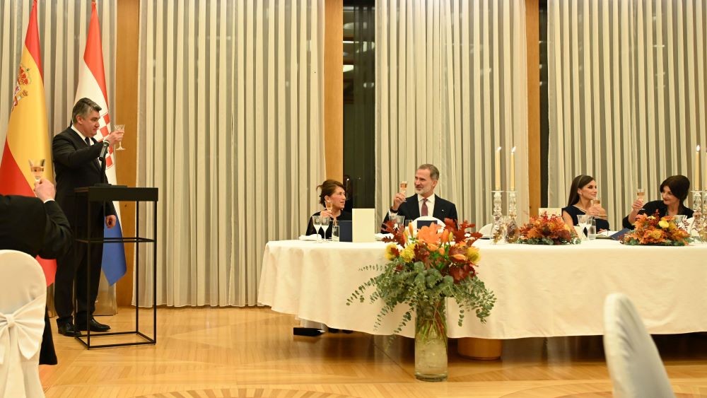 Predsjednik Republike Hrvatske Zoran Milanović i supruga predsjednika prof. dr. sc. Sanja Musić Milanović upriličili su svečanu večeru u čast Njihova Veličanstva španjolskog kralja Filipa VI. i kraljice Leticije, koji borave u službenom posjetu Republici Hrvatskoj. Predsjednik Milanović i kralj Filip VI. obratili su se uzvanicima na svečanoj večeri zdravicama koje prenosimo u cijelosti.