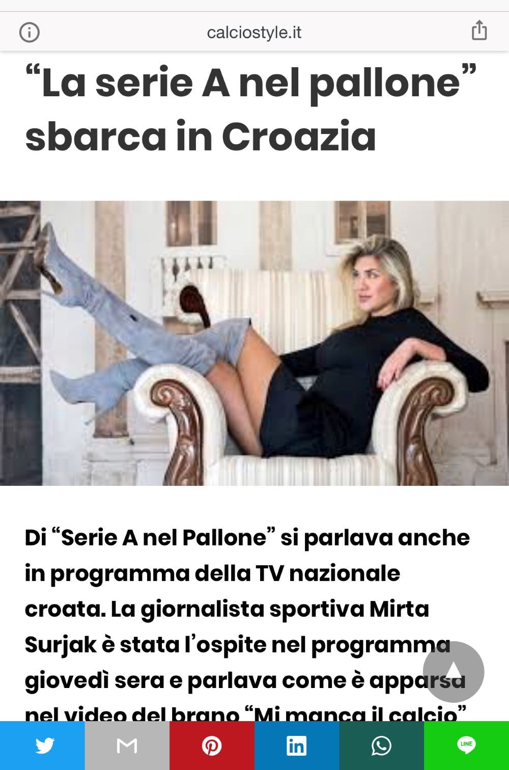 Sportska novinarka Hrvatske televizije, Mirta Šurjak, sve je bliže talijanskoj Serie A . Naime, izašao je novi članak koji Splićanku povezuje sa Serie A. Talijanski mediji popratili su činjenicu da se Mirta nalazi u špici showa Serie A nel Pallone koja je zapravo dio video spota za pjesmu “Mi manca il calcio” koju izvodi talijanski pjevač Ermanno Fabbri.