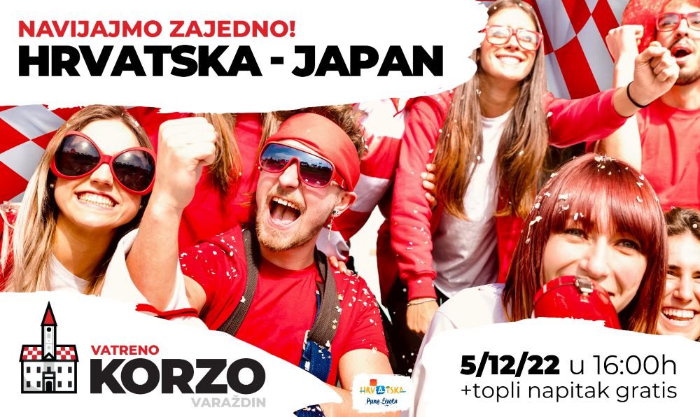 Na vatrenom Korzu nastavlja se praćenje utakmica hrvatske nogometne reprezentacije na velikom video zidu, a u ponedjeljak je sljedeća stanica na putu do vrha! Hrvatska s početkom u 16 sati igra osminu finala Svjetskog nogometnog prvenstva protiv Japana, strasti su uzavrele, bit će vruće usprkos vanjskim temperaturama, a da bi atmosfera bila zaista prava navijačka i da nas grla ne bi izdala, osigurat ćemo „rundu toplih napitaka“ na adventskim kućicama na Korzu.