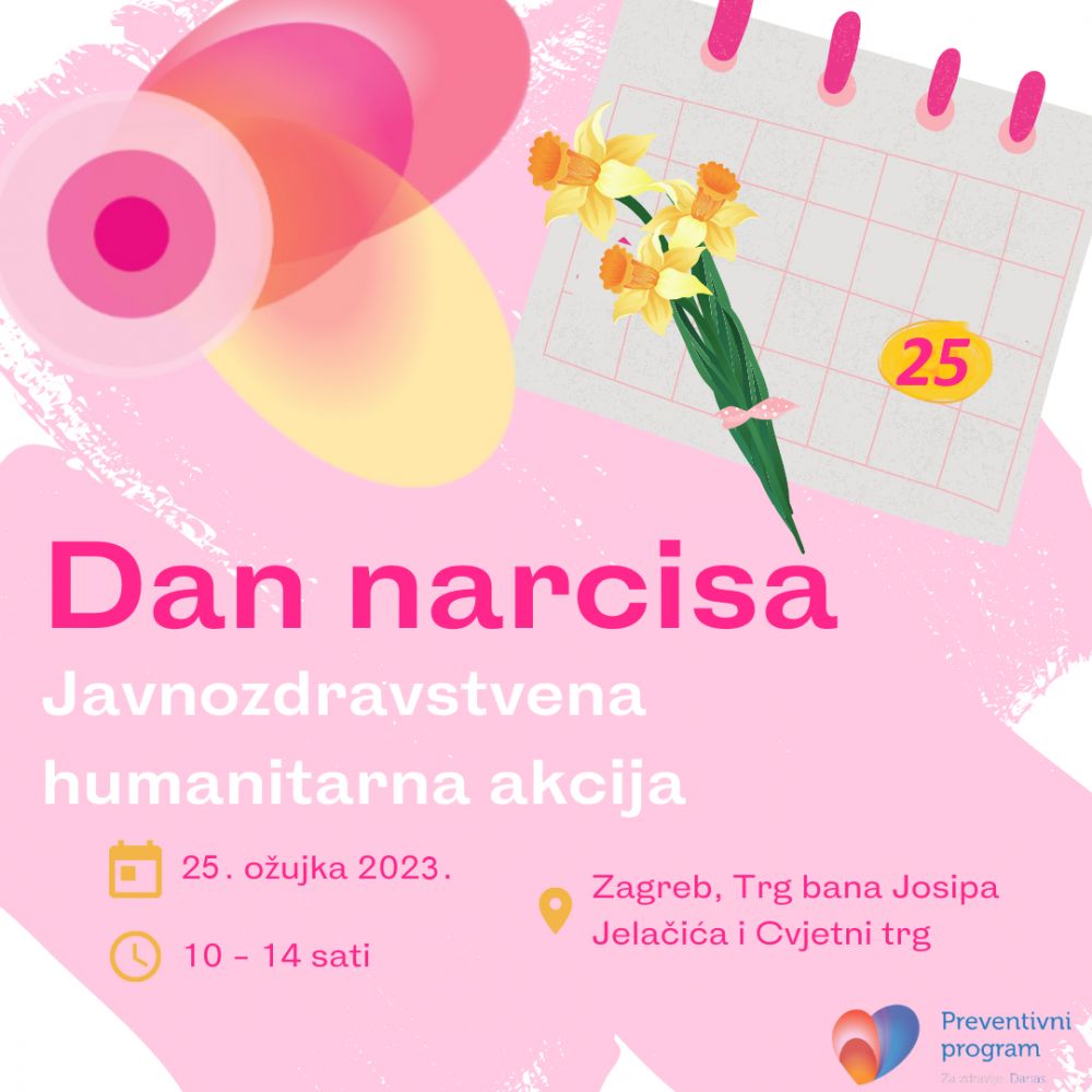 Pridružite nam se ovu subotu, 25. ožujka od 10 do 14 sati u Zagrebu, na Trgu bana Josipa Jelačića i na Cvjetnom trgu. Obilježavanja Dana narcisa održat će se i u nizu drugih gradova diljem Hrvatske.