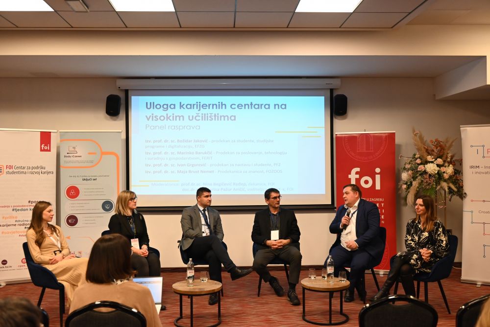 Osim za predstavljanje rezultata projekta, završna konferencija je bila prilika za razmjenu iskustava i diskusiju svih relevantnih dionika o temama vezanima uz razvoj stručne prakse, modela učenja kroz rad i rada karijernih centara na visokim učilištima, i to u okviru panel diskusije na temu „Uloga karijernih centara na visokim učilištima“ u kojoj su sudjelovali prodekani s drugih fakulteta: izv. prof. dr.sc. Božidar Jaković (Ekonomski fakultet, Zagreb), izv. prof. dr. sc. Marinko Barukčić (Fakultet elektrotehnike, računarstva i informacijskih tehnologija, Osijek), izv. prof. dr. sc. Ivan Grgurević (Fakultet prometnih znanosti, Zagreb) i izv. prof. dr. sc. Maja Brust Nemet (Fakultet za odgojne i obrazovne znanosti, Osijek). Panelicu su moderirale dekanica FOI-ja profesorica dr. sc. Nina Begičević Ređep i voditeljica projekta „Study4Career“ docentica dr. sc. Katarina Pažur Aničić.