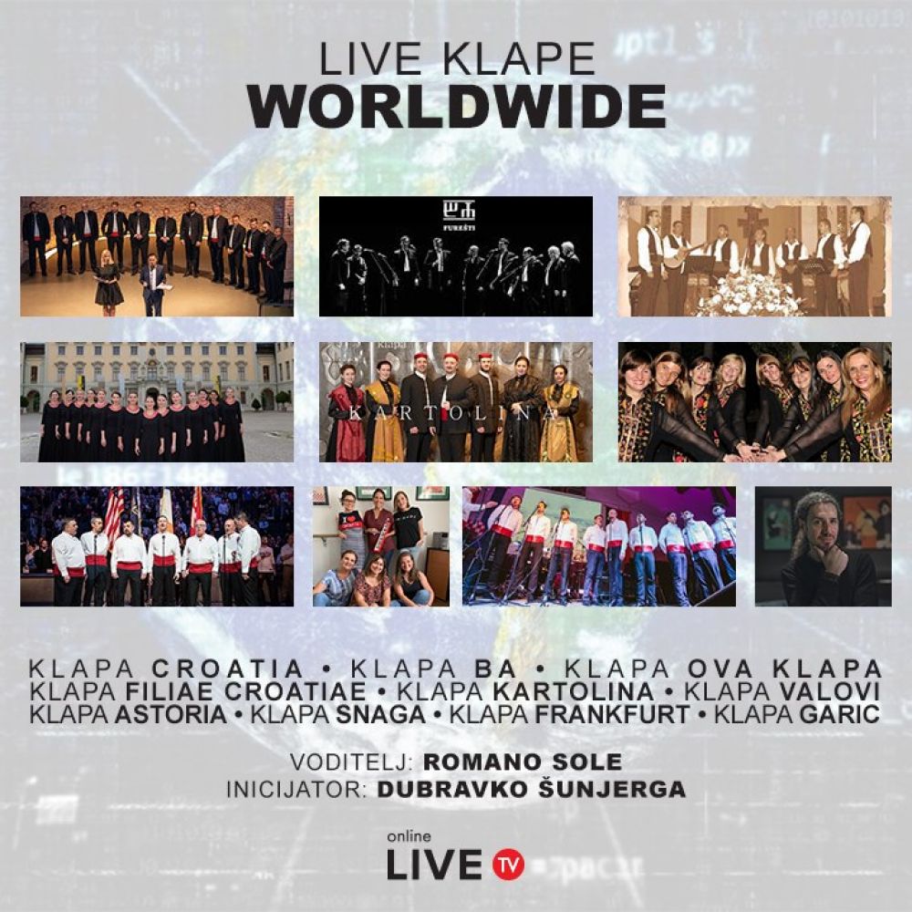 Devet klapa u kojima pjevaju naši iseljenici sa četiri kontinenta nastupit će u nedjelju, 18. listopada u 15 sati u programu ONLINE LIVE SHOW - Klape Worldwide na Facebooku.