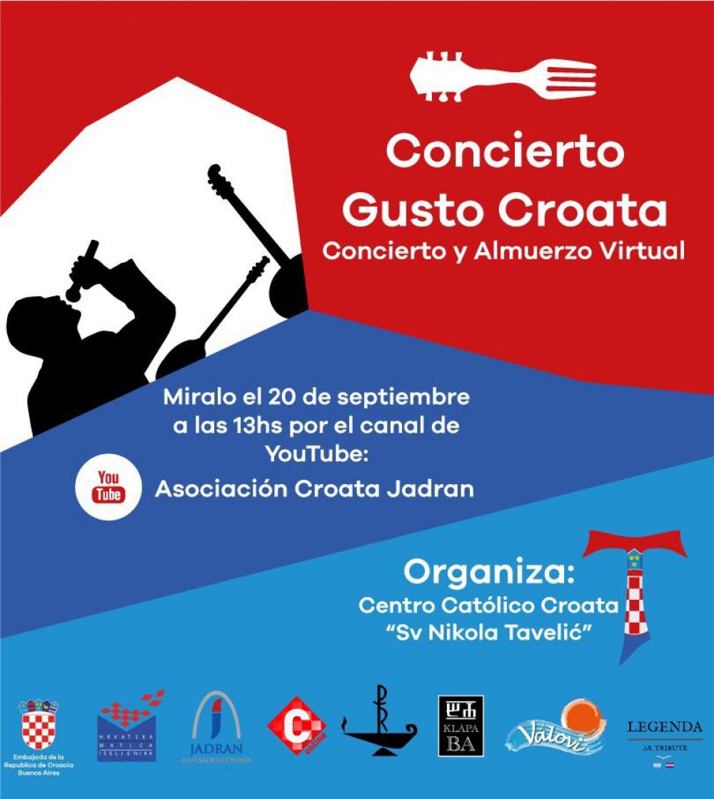 Iz Hrvatskoga katoličkog središta svetoga Nikole Tavelića poručili su: "Veselo vas pozivamo na koncert “Concierto Gusto Croata”, virtualno druženje koje preporučujemo za užitak uz hrvatsku hranu, svaki iz svoje kuće. U održavanja susreta u našem središtu, ovaj put putem malih ekrana, fra Joso Peranić je “otvorio vrata” uz blagoslov da bi se pokazala kultura hrvatskih predaka uz pjevače, svirače i posebne goste."