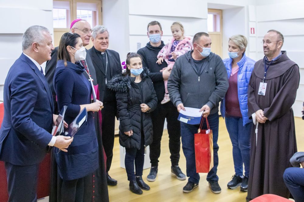 Obiteljima Kušan, Kusura, Polak, Nekić i Gabrić ugovore o novim kućama uručili su biskup Živković i ministar Horvat.