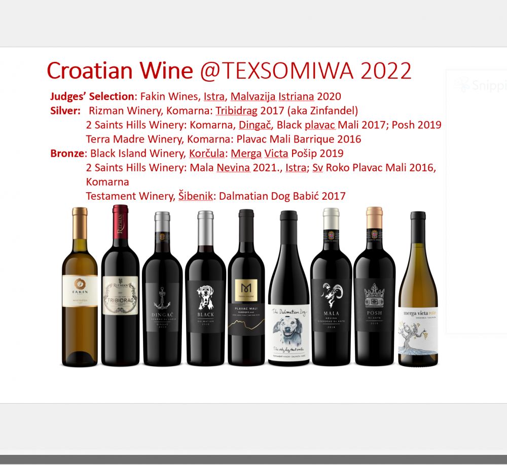 Hrvatska vinska alijansa (Croatian Wine Alliance), grupa svjetskih i američkih ekipa koje promoviraju hrvatska vina, jučer je sa zadovoljstvom objavila vijest da su hrvatski vinari višestruko nagrađeni na dodjeli nagrada TEXSOM u Texasu, ocjenjivanje koje je održano u svibnju ove godine. Dok je samo devet hrvatskih vinarija prijavilo svoja vina, sest ih je osvojilo ukupno devet nagrada, koje pokazuju dosljednu kvalitetu hrvatskog vinarstva.