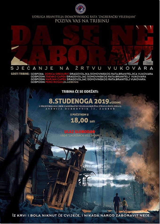 Sutra, u petak, 8. studenoga, u 18 sati, u znak sjećanja na žrtvu Vukovara u paviljonu 8, na Zagrebačkom velesajmu, Udruga branitelja domovinskog rata održava tribinu Da se ne zaboravi.