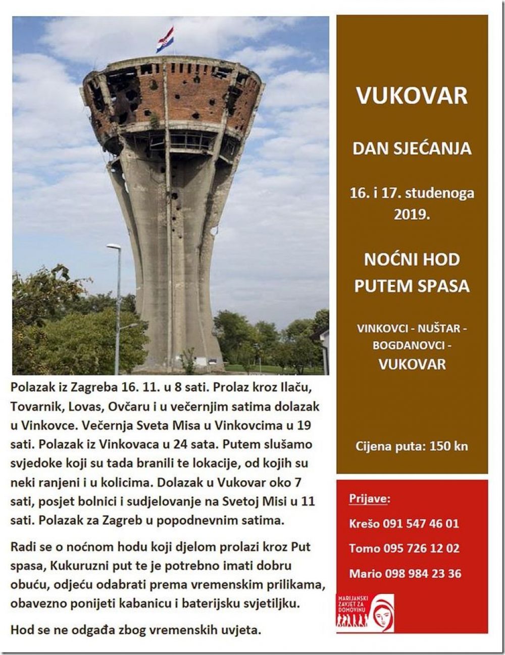 Hod se ne odgađa zbog vremenskih uvjeta. Lani se hodalo u noći 17. na 18.studenoga i mladima je to bilo posebno iskustvo upoznati svjedoke toga vremena koji su branili Bogdanovce, Nuštar, Vukovar.Ove godine ide se dan ranije uglavnom za one koji neće biti na sami 18. studenoga. Ako imate koga proslijedite. Cijena puta: 150 kn