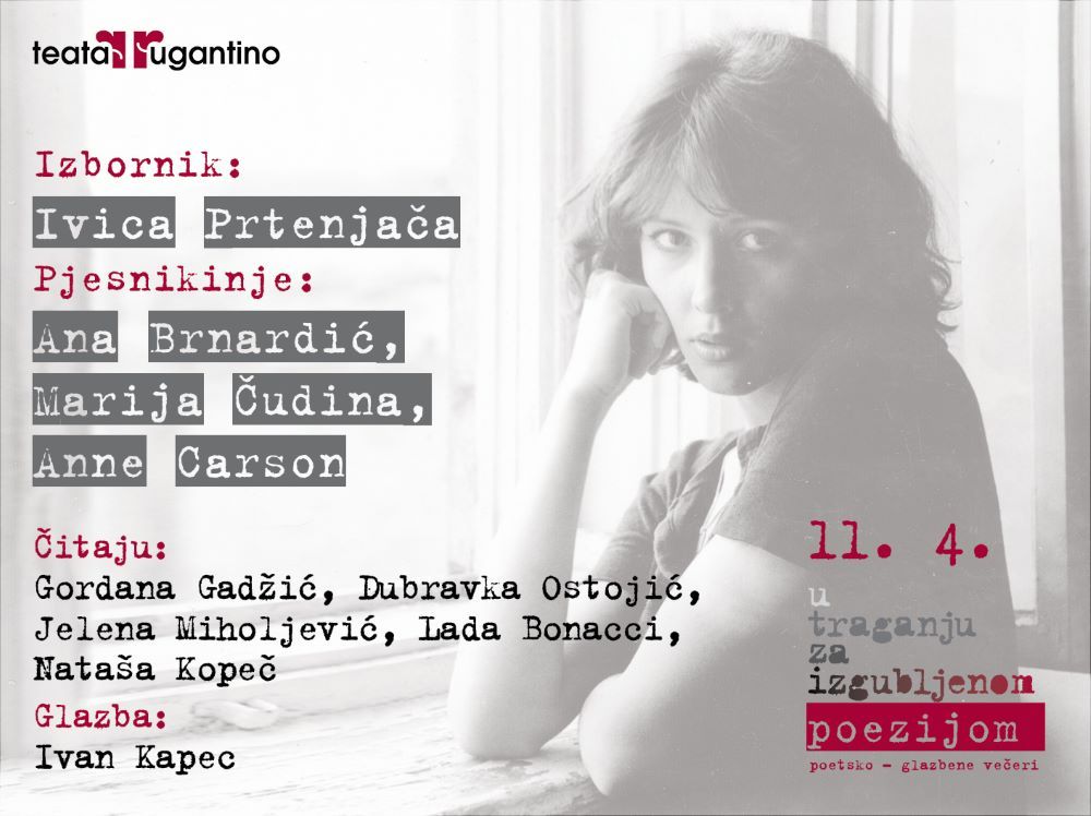 Prvom večeri poetsko-glazbenog ciklusa “U traganju za izgubljenom poezijom” u novouređenom Teatru Rugantino, Ciklusa koji će se moći gledati na platformama Facebook i YouTube (Teatar Rugantino), započinjemo 11. travnja u 19 sati s večeri autorica. Izbornik je Ivica Prtenjača, a poeziju Ane Brnardić, Marije Čudine i Anne Carson čitat će glumice Gordana Gadžić, Dubravka Ostojić, Jelena Miholjević, Lada Bonacci i Nataša Kopeč.
