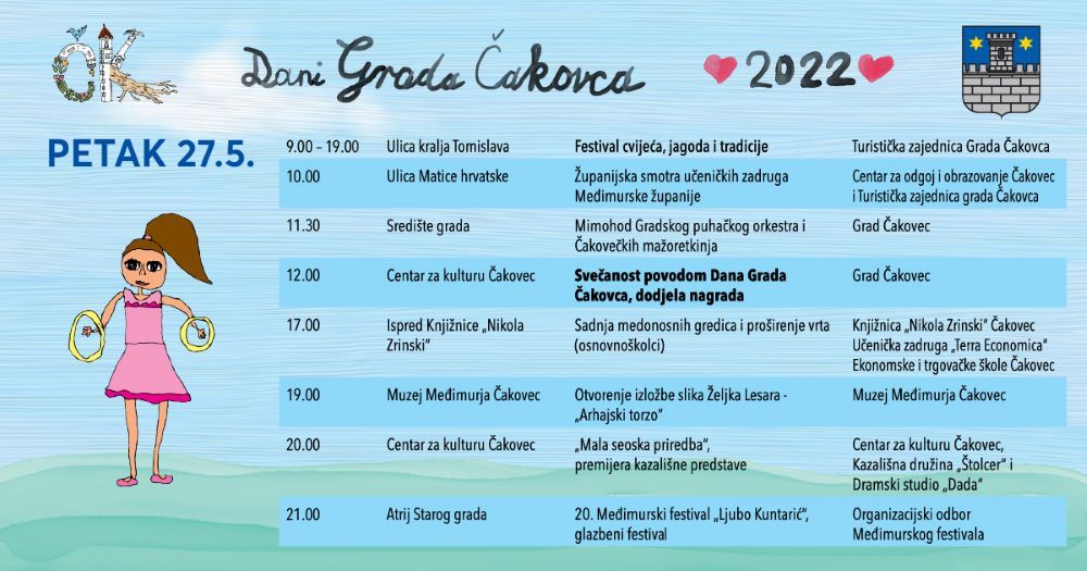 Od 10 sati na Trgu Republike u Čakovcu kreće Županijska smotra učeničkih zadruga Međimurske županije, u organizaciji škole domaćina Centra za odgoj i obrazovanje Čakovec i Turističku zajednicu grada Čakovca. Od 11:30 sati kreće mimohod Gradskog puhačkog orkestra i Čakovečkih mažoretkinja, uz Zrinsku gardu Čakovec. Mimohod kreće u Ulici kralja Tomislava te završava na Trgu Republike prigodnim programom.