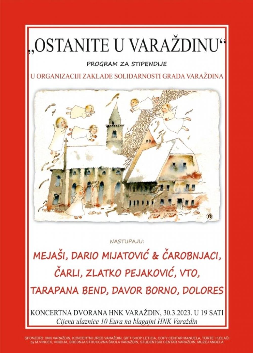U tu svrhu Zaklada solidarnosti u četvrtak 30. ožujka u 19:00 sati u HNK-u Varaždin, priređuje dobrotvorni Koncert na kojem će nastupiti poznati, renomirani pjevači i bendovi varaždinske i hrvatske zabavne glazbene scene: Mejaši, Dolores, Zlatko Pejaković, Čarli, VTO, Dario Mijatović& Čarobnjaci, Frane Pehar & Tarapana Bend i Davor Borno.
