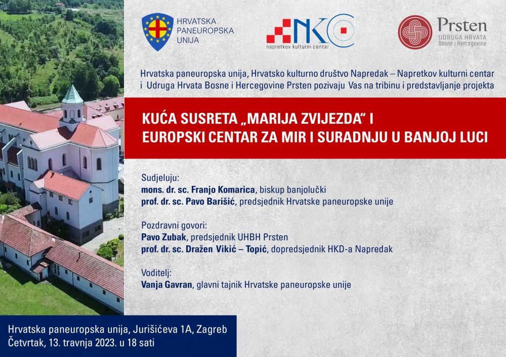 Banjolučki biskup mons. dr. sc. Franjo Komarica bit je jedan od sudionika tribine u Zagrebu na kojoj će se predstaviti projekt Kuća susreta „Marija Zvijezda“ i Europski centar za mir i suradnju u Banjoj Luci.Tribina, koju organiziraju Hrvatska paneuropska unija, Hrvatsko kulturno društvo Napredak – Napretkov kulturni centar i Udruga Hrvata Bosne i Hercegovine Prsten, bit će održana u četvrtak, 13. veljače u 18 sati u Hrvatskoj paneuropskoj uniji – Jurišićeva 1A.