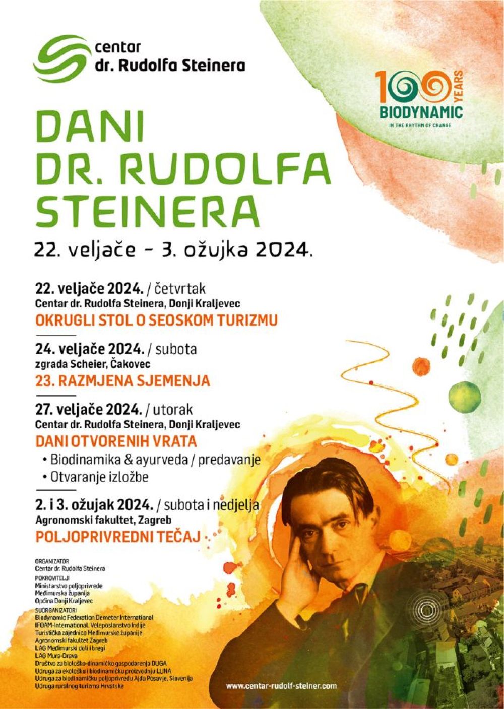 Uz obilježavanje 163. obljetnice rođenja dr. Rudolfa Steinera te 100 godina biodinamike, Centar dr. Rudolfa Steinera organizira sada već tradicionalnu manifestaciju "Dani dr. Rudolfa Steinera". Manifestacija će se održati od 22. veljače do 3. ožujka 2024. godine na nekoliko lokacija kao što je navedeno na plakatu. - Pridružite nam se u proslavi života i nasljeđa dr. Rudolfa Steinera te zajedno istražujmo dubine biodinamičkog pristupa poljoprivredi i životu - pozivaju organizatori.