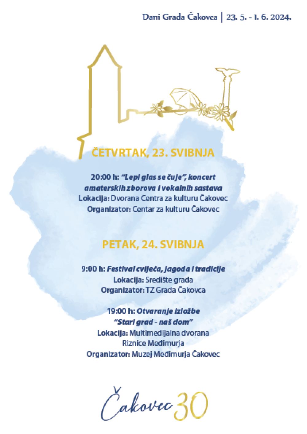 Navečer u 19 sati pak u organizaciji Muzeja Međimurja u Multimedijalnoj dvorani Riznice Međimurja otvara se izložba “Stari grad Čakovec-naš dom“. Ovom izložbom Muzej Međimurja Čakovec , u povodu 70. obljetnice, odaje počast svim stanarima koji su kroz prošla stoljeća, bilo privatno, bilo kao javne ustanove, živjeli u prostorima Starog grada u Čakovcu. Izložba tematizira povijest Staroga grada, s posebnim osvrtom na njegove stanare, od grofa Čaka i ostalih plemićkih obitelji do običnih građana koji su u njemu pronašli svoj dom.