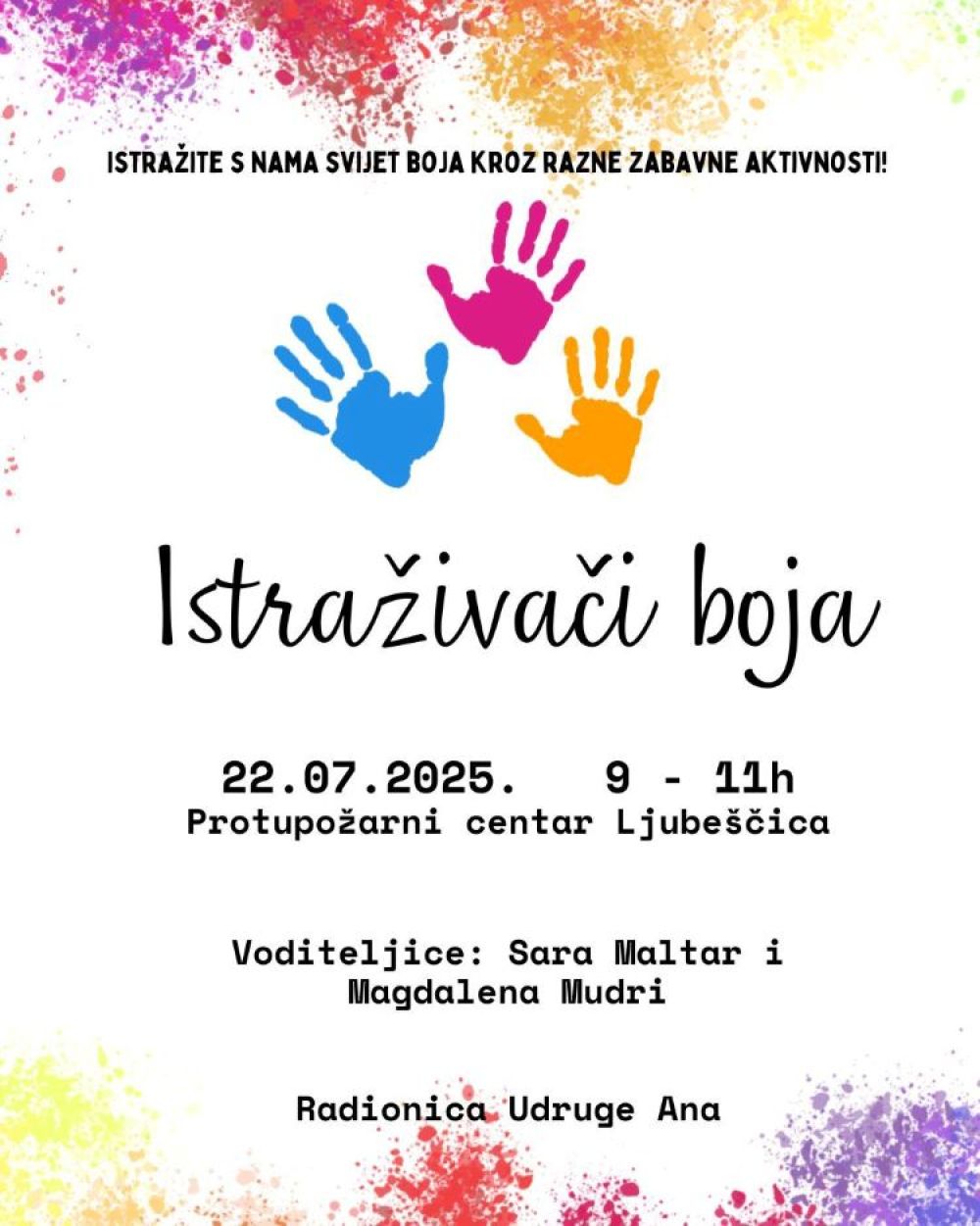Općina Ljubešćica obavještava sve roditelje i djecu kako će se u utorak, 22. srpnja 2025. godine, održati dječja radionica pod nazivom “Istraživači boja”.