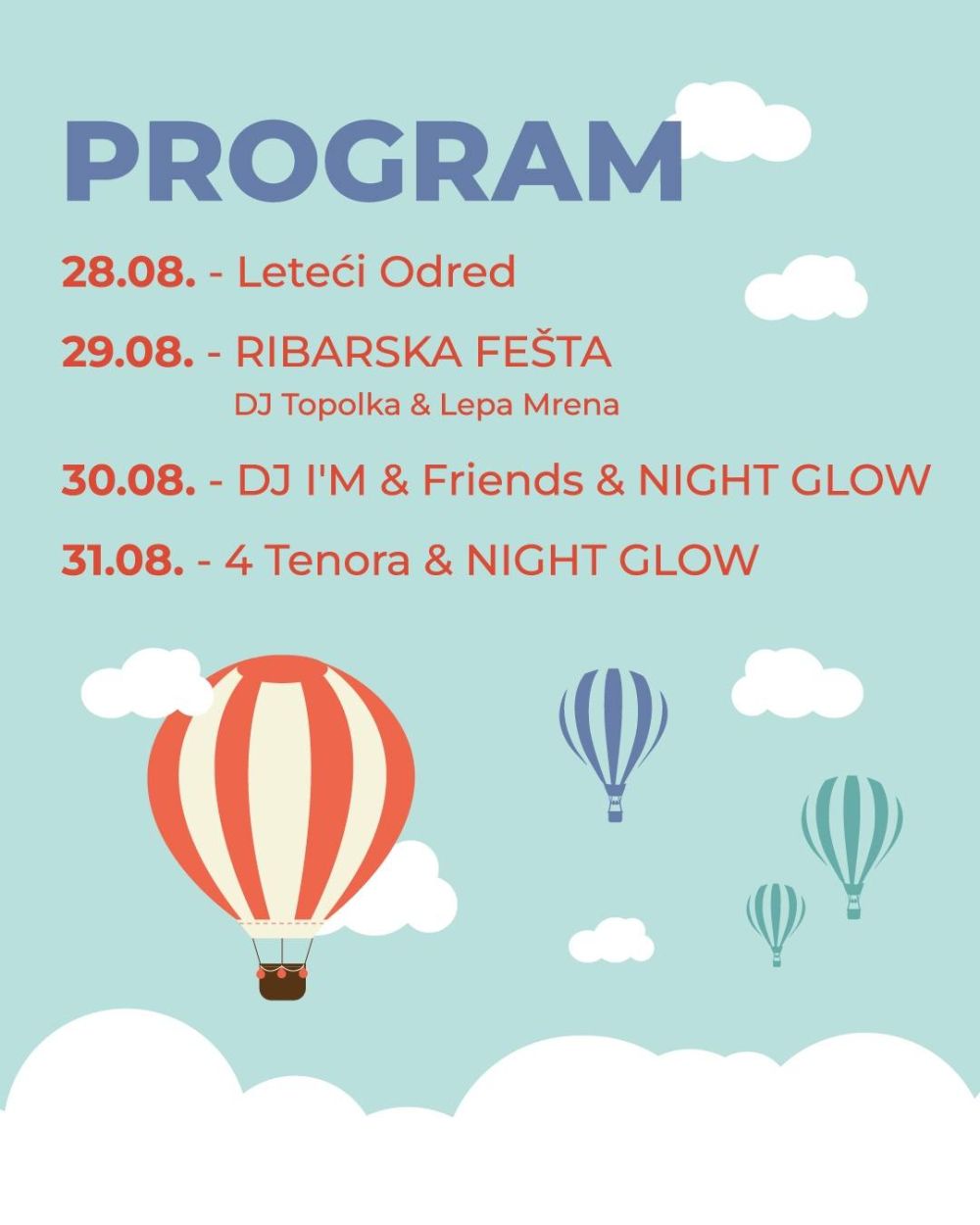Tijekom jutra i predvečerja posjetitelji će moći uživati u letovima u zoru i pri zalasku sunca, uz edukativne demonstracije i natjecanja, dok će večernji sati biti rezervirani za spektakularne Night Glow performanse, noćne iluminacije balona usklađene s glazbom. Glazbeni program festivala donosi nastup grupe Leteći Odred, ribarsku feštu s DJ Topolkom i Lepom Mrenom, energične DJ setove I’M-a i prijatelja te završni koncert u izvedbi popularnih 4 Tenora.