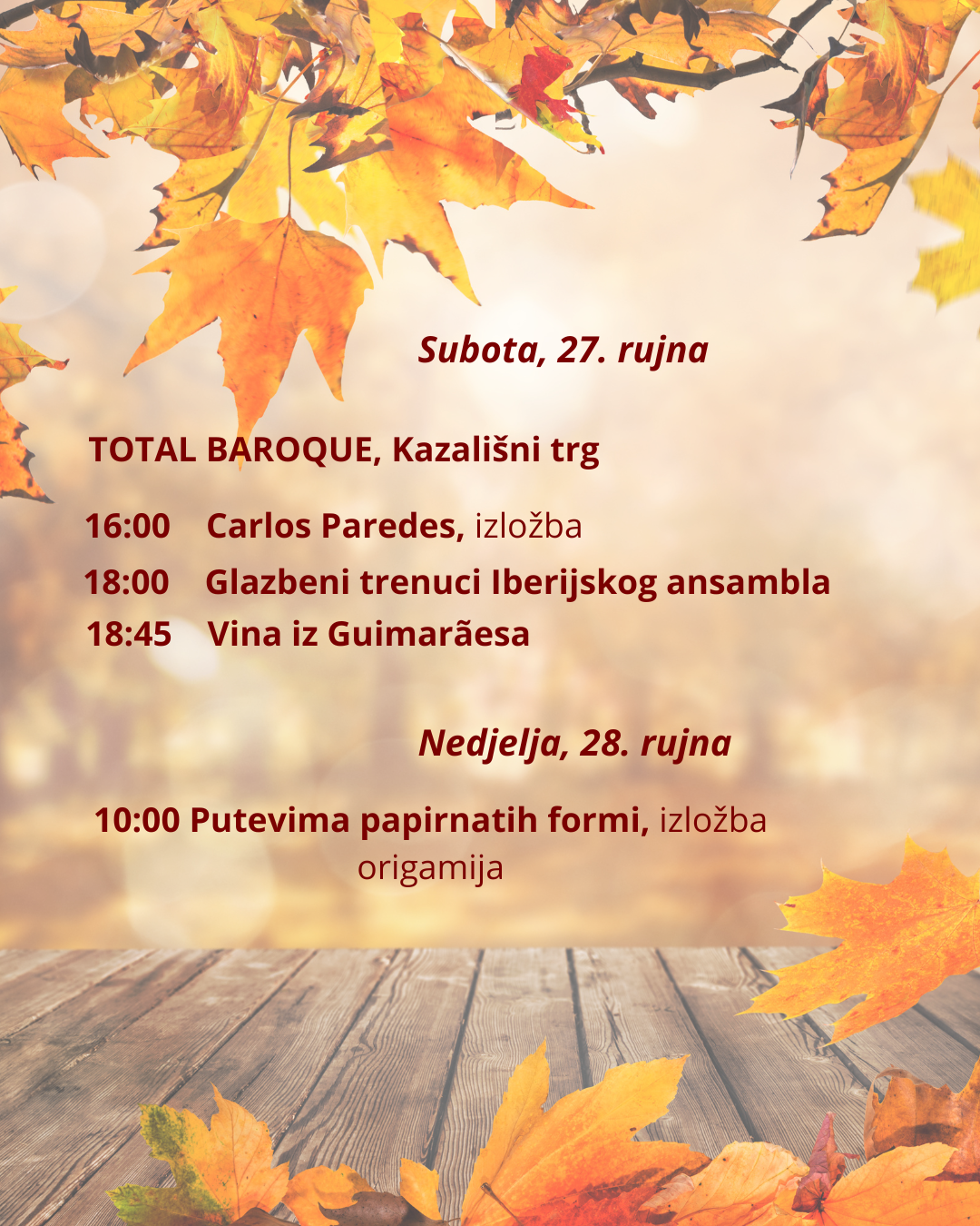 Na Korzu će od 10 sati biti obilježen Dan turizma kroz predstavljanje turističkih zajednica s područja Varaždinske županije, a program Total Baroque na Kazališnom trgu od 16 sati donosi ugođaj Portugala kroz spoj izložbe, glazbe i degustacije vina. U nedjelju, 28. rujna, u Palači Patačić od 10 sati posjetitelji mogu razgledati izložbu origamija pod nazivom “Putevima papirnatih formi”. Sve programa u sklopu „Jeseni u Varaždinu“ Turistička zajednica grada Varaždina objedinila je u programskoj knjižici koju možete preuzeti u Turističko informativnom centru (Ivana Padovca 3).