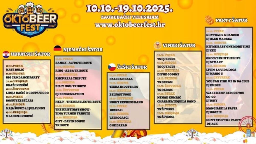 Na pozornicama će se izmjenjivati poznata glazbena imena poput Maje Šuput, Dražena Zečića, Colonie, Mate Bulića, kao i brojni tribute bendovi koji će podsjetiti na glazbu Queena, AC/DC-a, Beatlesa i Tine Turner. Uz glazbeni program, organizatori su pripremili i mnoštvo dodatnih sadržaja: rolalište od 600 m², LEGO šator “Bricktoberfest”, veliki lunapark i nagradne igre s vrijednim poklonima – uključujući i mogućnost osvajanja automobila! Festival svakodnevno otvara vrata od 13 sati uz besplatan ulaz do 18 sati, nakon čega iznosi 20 eura (djeca do 16 godina i osobe s invaliditetom imaju besplatan ulaz cijeli dan). Veliko otvorenje 10. listopada obilježit će spektakularan dron show nad Zagrebom. Za više informacija i dnevni program posjetite www.oktobeerfest.hr.
